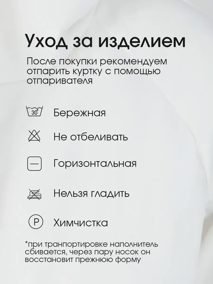 | Уход за вещами | деликатная стирка; допускается отпаривание; отбеливание запрещено | |
