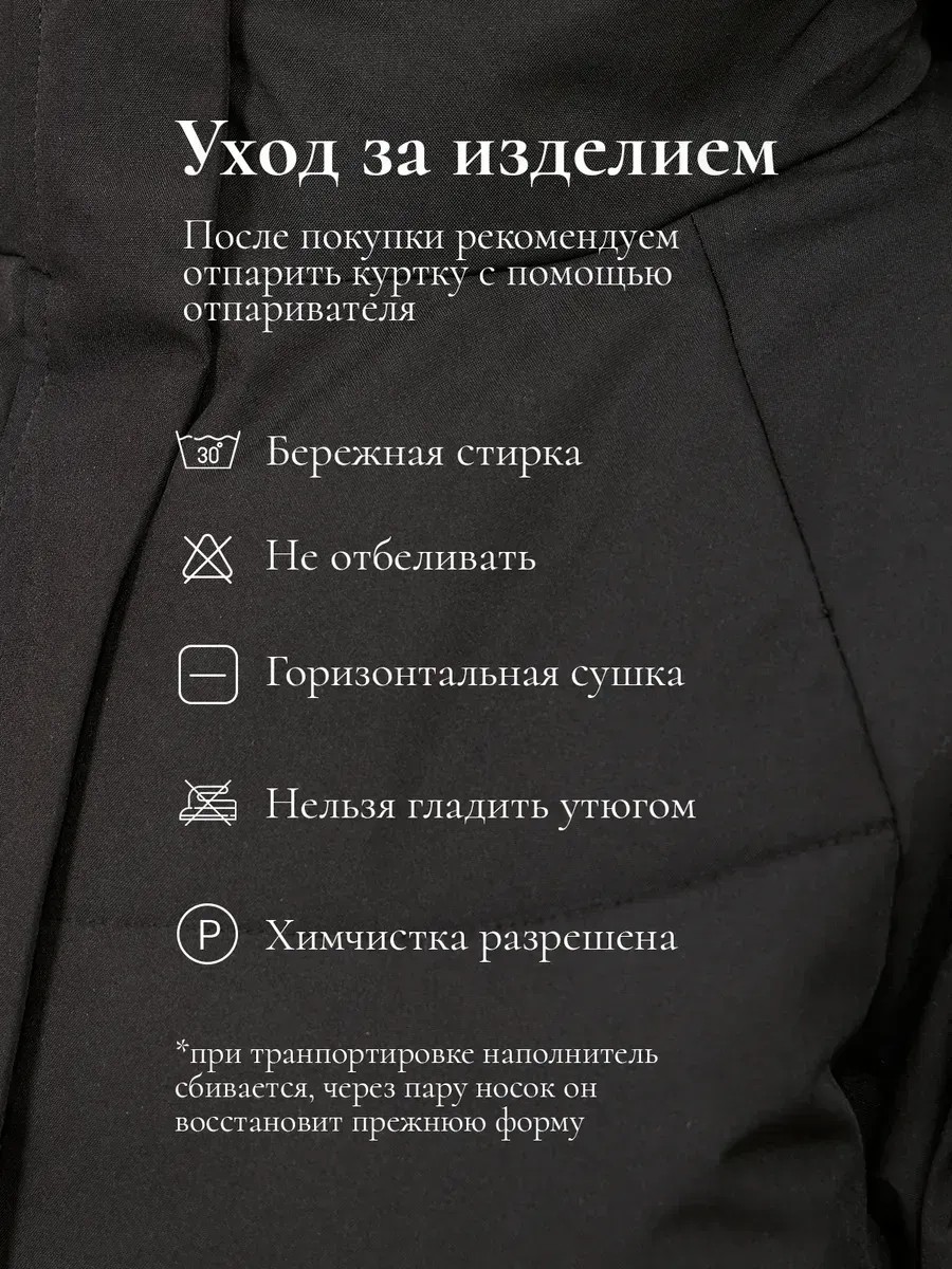 | Уход за вещами | деликатная стирка; допускается отпаривание; отбеливание запрещено | |