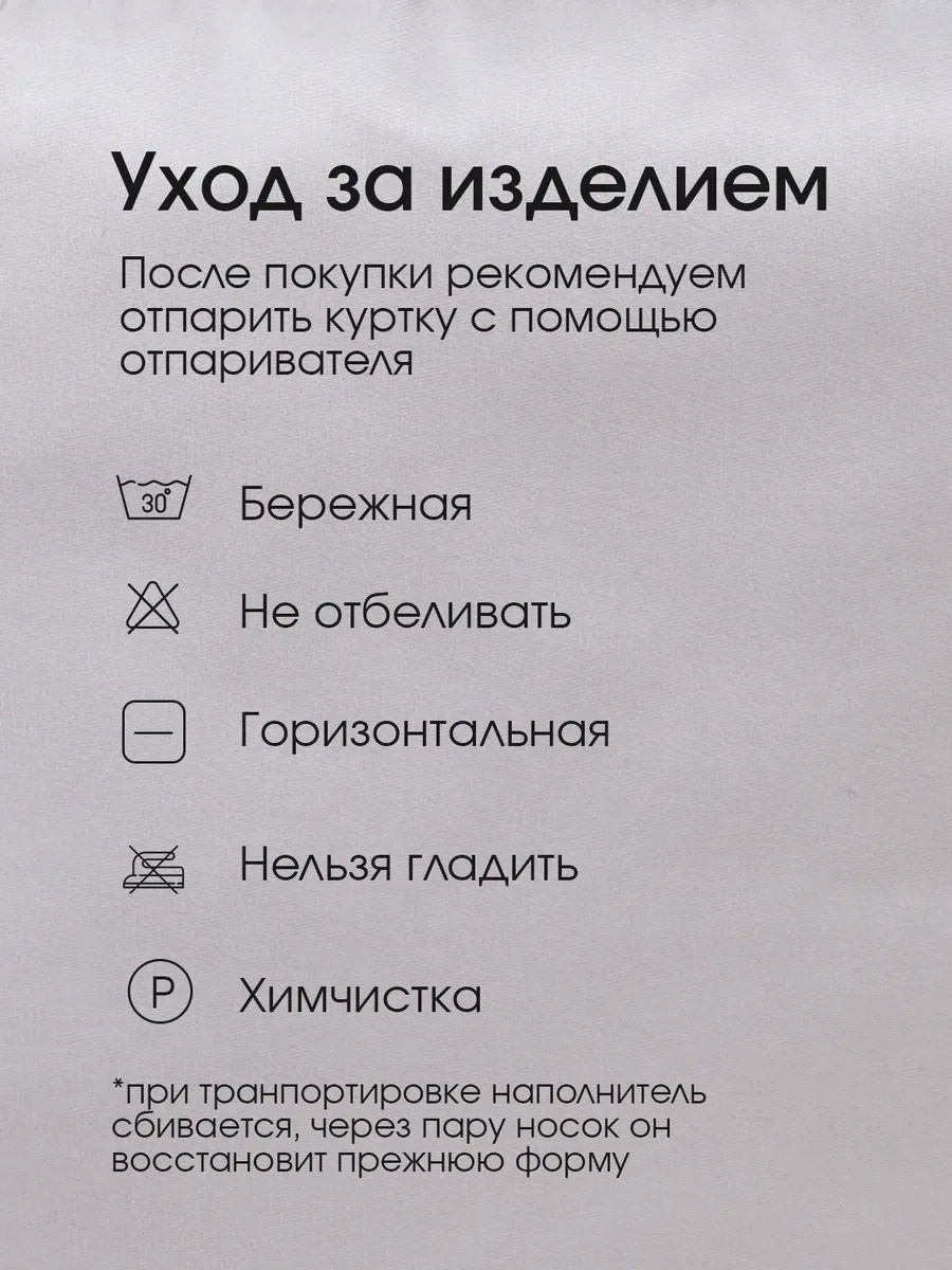 | Уход за вещами | деликатная стирка; допускается отпаривание; отбеливание запрещено | |